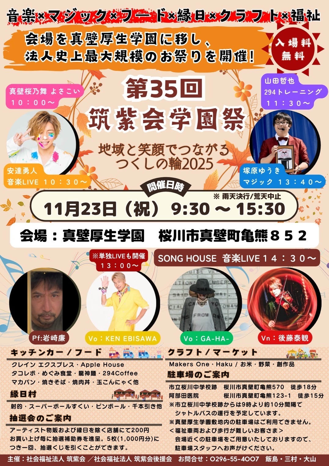 2025.11.23(Sun) LIVE 11/23(日)筑紫会学園祭2025出演決定! 11/23(日)筑紫会学園祭2025出演決定! 日時:2025年11/23(日) 会場:真壁厚生学園 '(桜川市真壁町亀熊852) 安達勇人LIVE時間:10:30~ *観覧無料